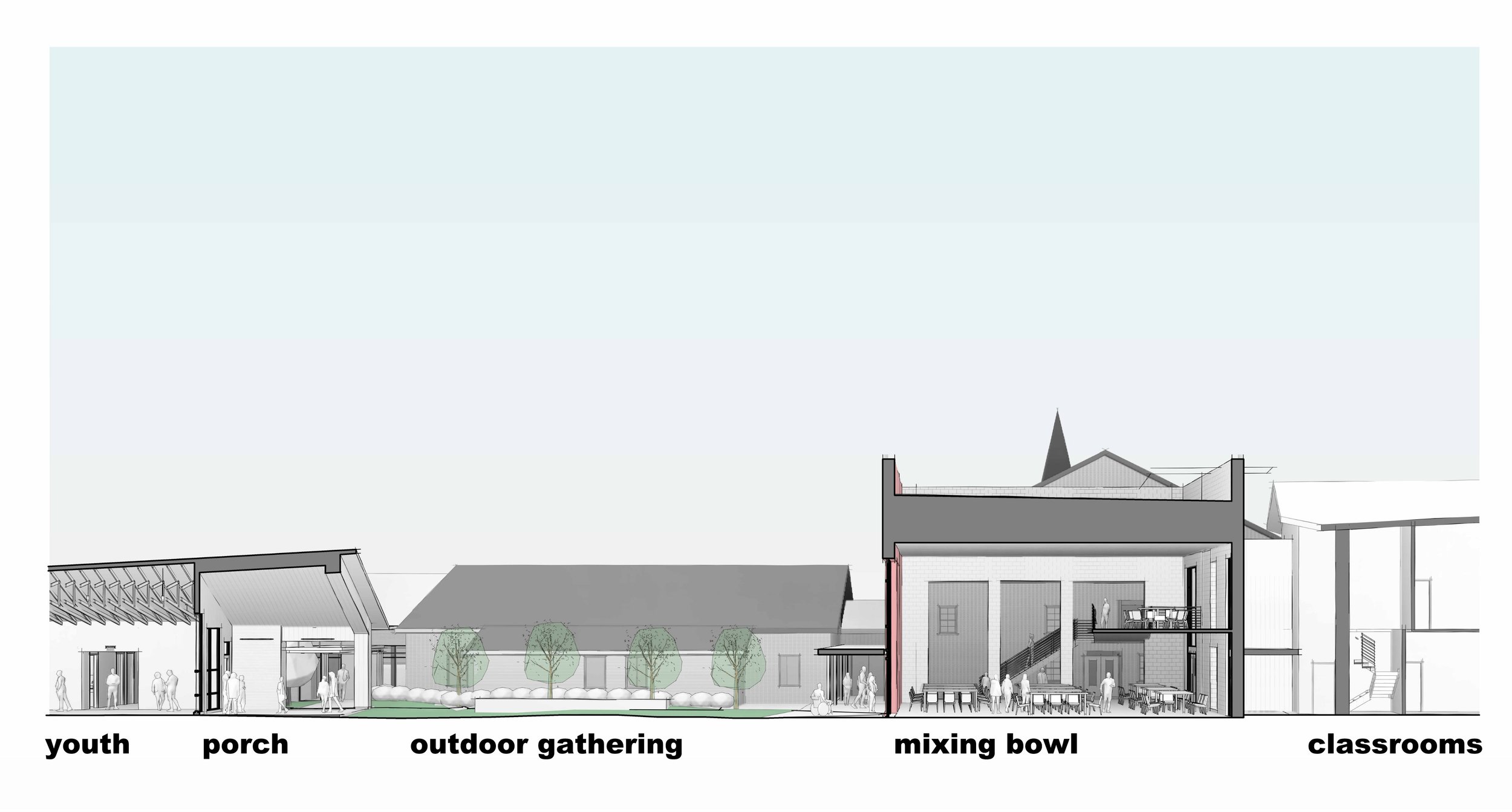The church campus masterplan unites two distinct yet complementary projects: the Youth Addition and the Mixing Bowl, creating a cohesive and functional space that enhances community engagement across all age groups. This comprehensive approach integrates new facilities into the existing site while fostering a sense of connection and accessibility for the congregation.